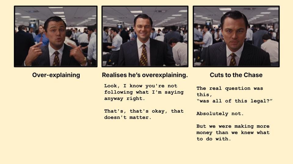 He was being salesy, persuasive even in his monologue - until he stopped, realised he was overexplaining, boring and using terminology that was likely "going over" his audiences head ("going over one's head" means when something you say is too advanced for the listener to understand and so it "goes straight past them" or "goes in one ear and out the other"). So what did he do? Yes. He cuts to the chase!