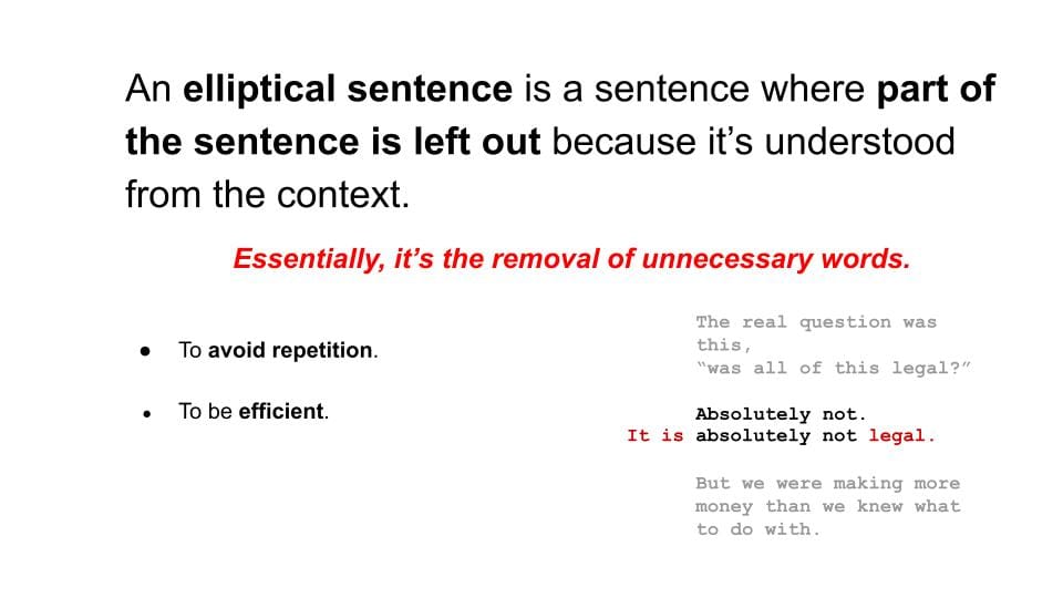 This brings me to the grammar connection, in particular, the elliptical sentence structure. You see the last part of DiCaprio's speech... where he says "Was it legal? Absolutely not". Well, 'Absolutely Not' is an elliptical sentence.