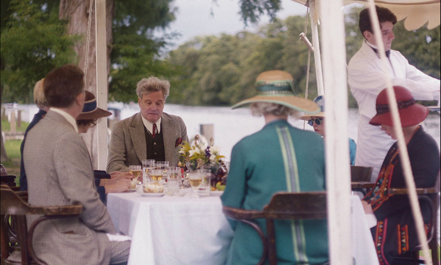 Colin Firth, the gentleman with grey hair at the head of the table continues relentlessly throughout the film to mention the weather... "It's a perfect day, it really is"..."Have you seen the weather, it really is gorgeous today. How lovely, perfect day for a bike ride!"