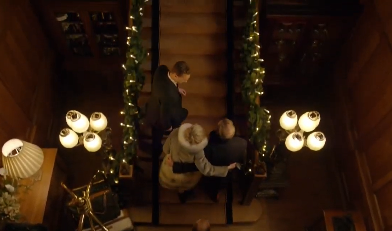 He greets a large group of high-end guests and then leads them to their rooms. Exchanging pleasantries with a couple. We can sense that male guest is what you'd describe as a no-nonesense kind of person, and as the viewer, we understand that he's to be the villain of the story. Just because of his demeanor and attitude.